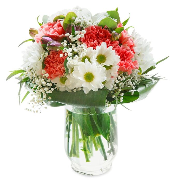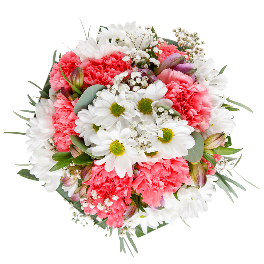 Discover the artistry of our timeless bouquet. With pristine white chrysanthemums, gentle gypsophila, and blush-toned light pink carnations accentuated by lush aspidistra leaves, every element is hand-picked to ensure the ultimate in freshness and lasting beauty.